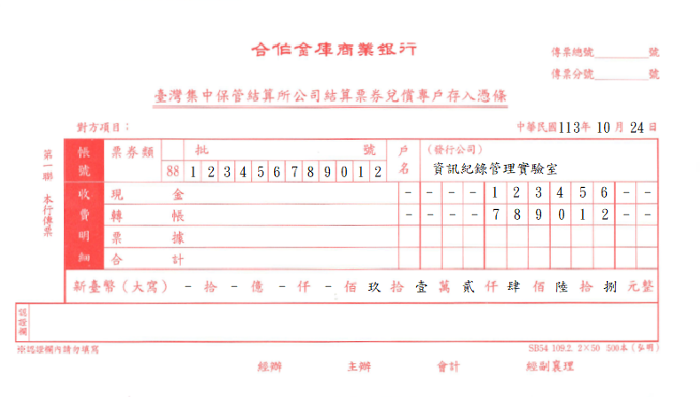 臺灣集中保管結算所結算票券兑償專戶存入憑條